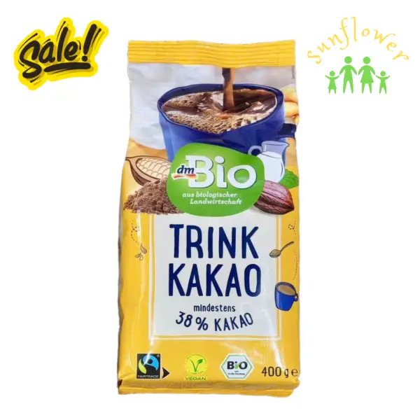 - Bột cacao hữu cơ dmBio Trink Kakao 400g của Đức được sản xuất từ nguồn nguyên liệu canh tác bền vững và đạt chuẩn Fairtrade. Với ít nhất 38% cacao nguyên chất, sản phẩm mang lại hương vị đậm đà, tự nhiên và hoàn toàn không chứa thành phần động vật, phù hợp cho cả người ăn chay, thuần chay. Không chỉ là thức uống ngon miệng, bột cacao còn giàu chất chống oxy hóa, giúp bổ sung năng lượng và cải thiện tâm trạng. Đây là lựa chọn lý tưởng cho gia đình hiện đại hướng đến lối sống lành mạnh.