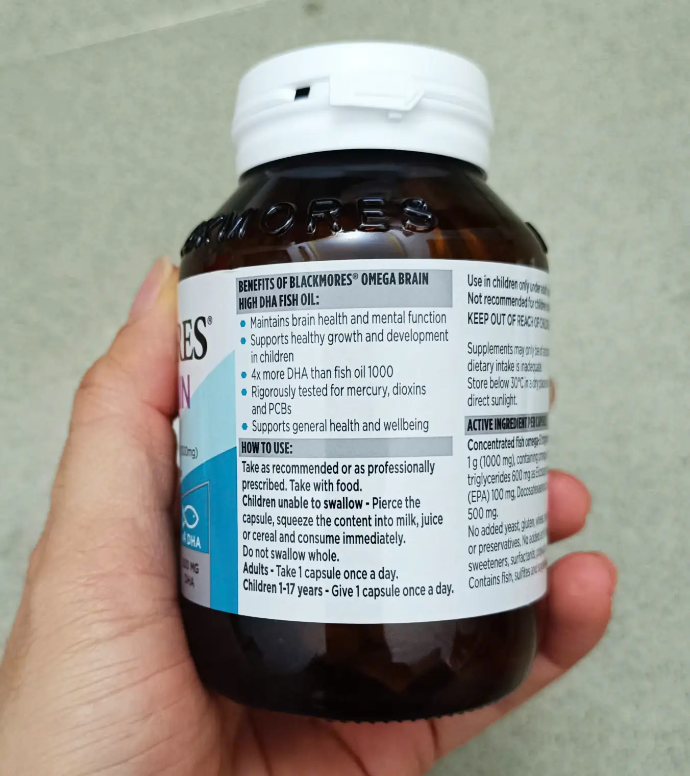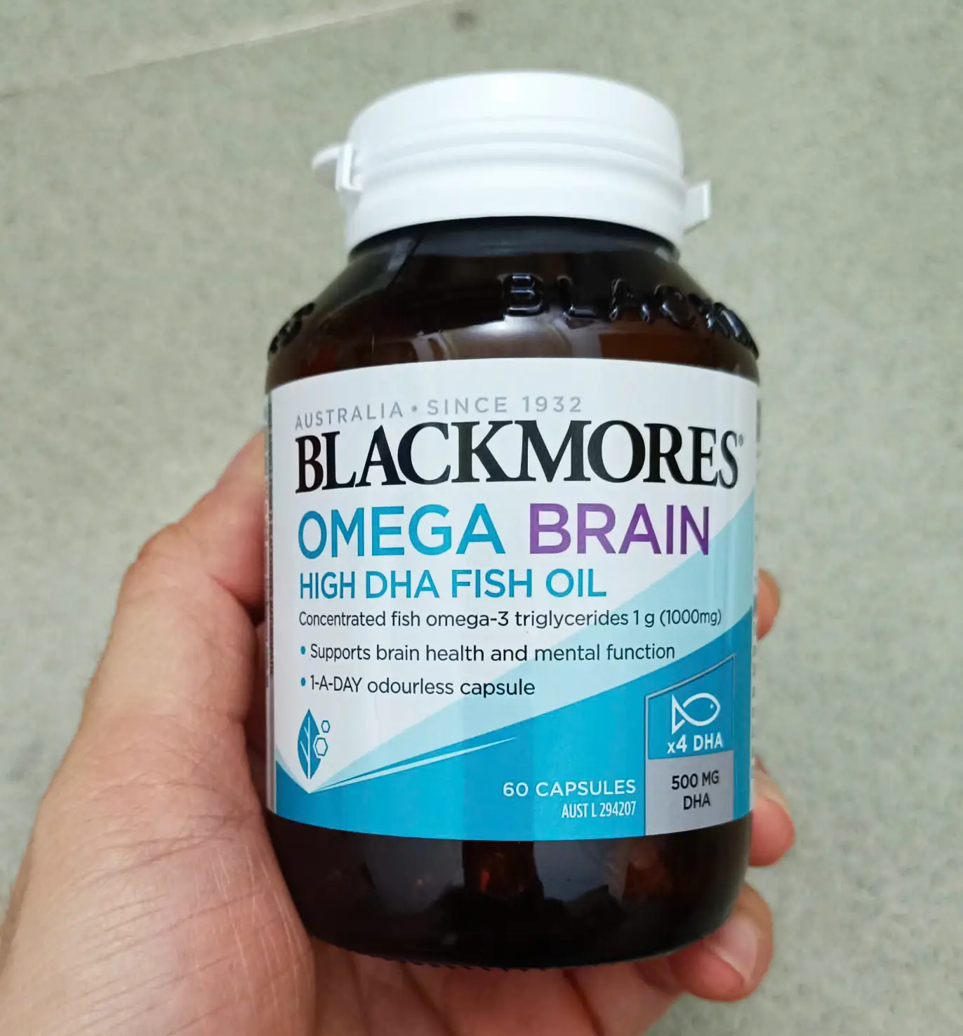- Viên uống Blackmores Omega Brain High DHA Fish Oil 60 viên của Úc là giải pháp hỗ trợ sức khỏe trí não hiệu quả. Với hàm lượng DHA cao gấp đôi so với dầu cá thông thường, sản phẩm giúp cải thiện trí nhớ, tăng khả năng tập trung và học tập. Đồng thời hỗ trợ hệ tim mạch khỏe mạnh và giảm viêm hiệu quả.
