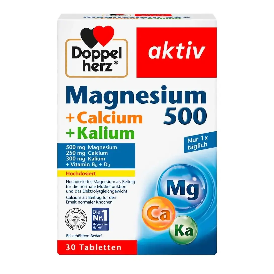 - Doppelherz Magnesium 500 Calcium Kalium 30 viên từ Đức là sản phẩm bổ sung magie, canxi và kali giúp hỗ trợ xương chắc khỏe, giảm chuột rút và tăng cường sức khỏe tim mạch. Với công thức cân đối từ thương hiệu Doppelherz, một trong những hãng thực phẩm chức năng uy tín tại Đức, sản phẩm giúp cải thiện sức khỏe cơ bắp, hỗ trợ hệ thần kinh và duy trì huyết áp ổn định. Viên uống này phù hợp cho người vận động nhiều, người cao tuổi và những ai cần bổ sung khoáng chất để duy trì sức khỏe tốt hơn.