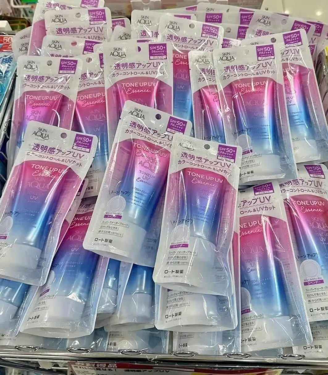 - Kem chống nắng Skin Aqua Tone Up UV Essence SPF50+ PA++++ Lavender chính là giải pháp hoàn hảo dành cho bạn! Đây là dòng kem chống nắng kết hợp nâng tông da độc đáo từ thương hiệu Rohto Nhật Bản, với sắc tím hồng gradient quyến rũ giúp hiệu chỉnh sắc da tức thì. Sản phẩm không chỉ bảo vệ da toàn diện trước tia UVA/UVB với chỉ số SPF50+ PA++++ mà còn chứa hạt ngọc trai Strobe Pearl siêu mịn tạo hiệu ứng da sáng hồng trong suốt, rạng ngời tự nhiên. Với công thức chứa Hyaluronic Acid và Vitamin C từ thiên nhiên, sản phẩm vừa chống nắng vừa dưỡng ẩm, giúp da luôn mềm mại, căng bóng suốt cả ngày mà không cần trang điểm.