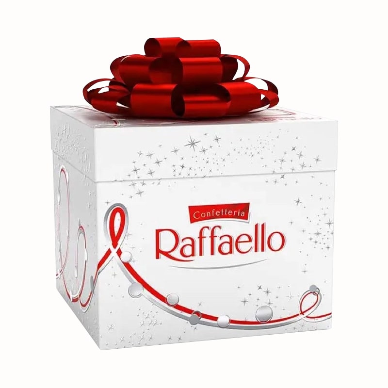 - Hộp vuông được thiết kế tối giản nhưng đầy thanh lịch, điểm nhấn là chiếc nơ đỏ rực rỡ, tượng trưng cho sự sang trọng và tình cảm chân thành. Với thiết kế này, kẹo Raffaello không chỉ là món ăn, mà còn là món quà hoàn hảo để trao tặng trong các dịp lễ, Tết, Giáng Sinh, Lễ Tình Nhân hoặc những buổi gặp mặt quan trọng.