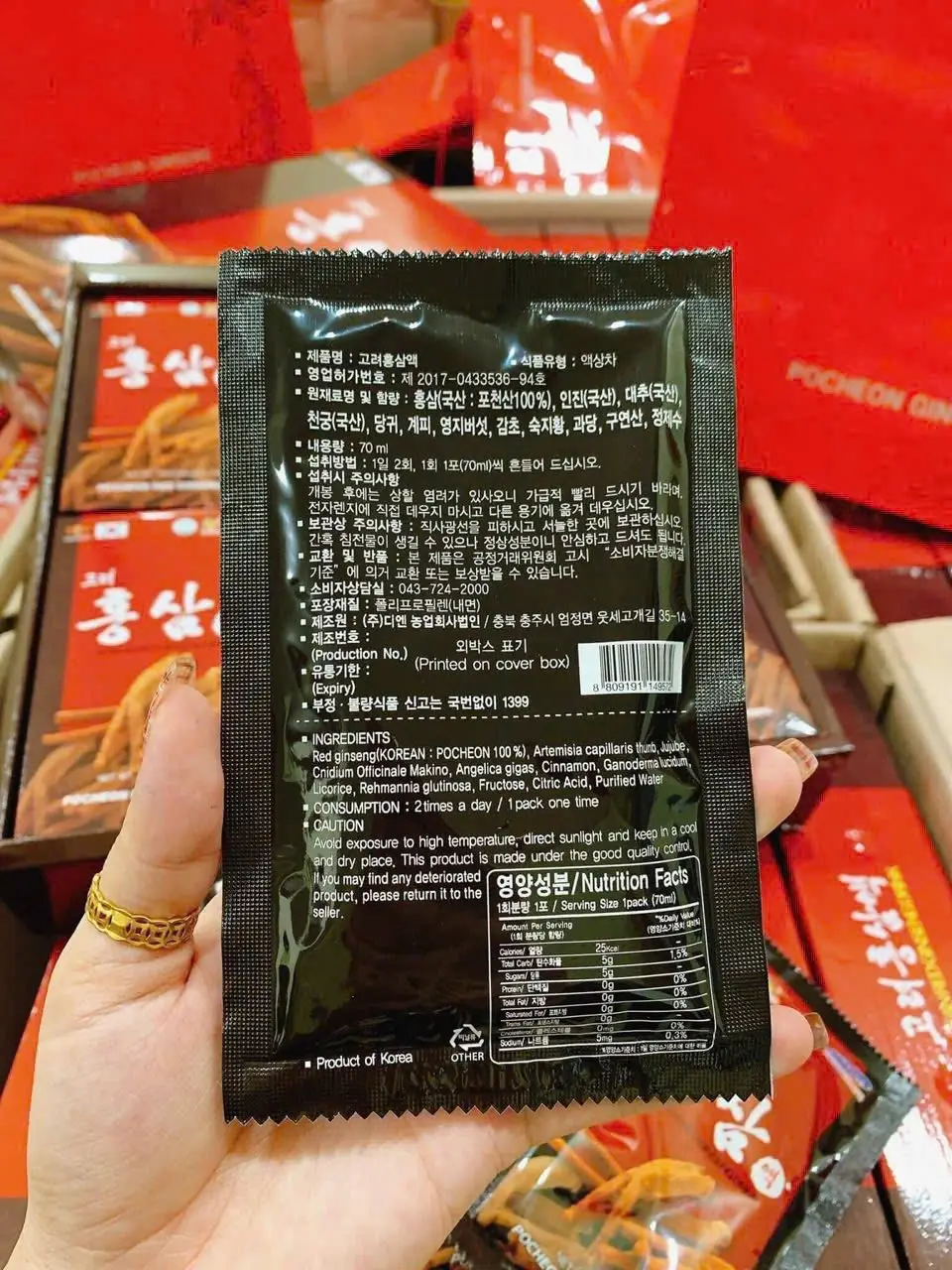- Nước hồng sâm Pocheon Korean Red Ginseng Drink 30 gói là tinh hoa sức khỏe từ Hàn Quốc, được chiết xuất từ những củ Hồng sâm 6 năm tuổi chất lượng cao, giữ trọn vẹn giá trị dinh dưỡng. Sản phẩm được bào chế dạng nước uống đậm đặc, đóng gói thành từng gói nhỏ tiện lợi, dễ dàng sử dụng mọi lúc, mọi nơi. Với công thức kết hợp nhiều loại thảo dược quý, đây không chỉ là thức uống bồi bổ mà còn là món quà sức khỏe sang trọng, ý nghĩa dành tặng những người thân yêu. Chỉ cần một gói mỗi ngày, bạn đã cung cấp nguồn năng lượng dồi dào và hỗ trợ tăng cường sức đề kháng vượt trội!