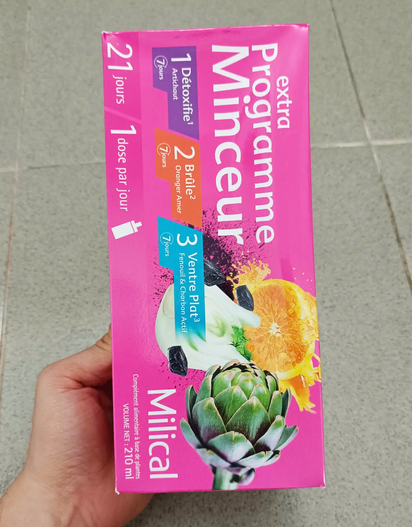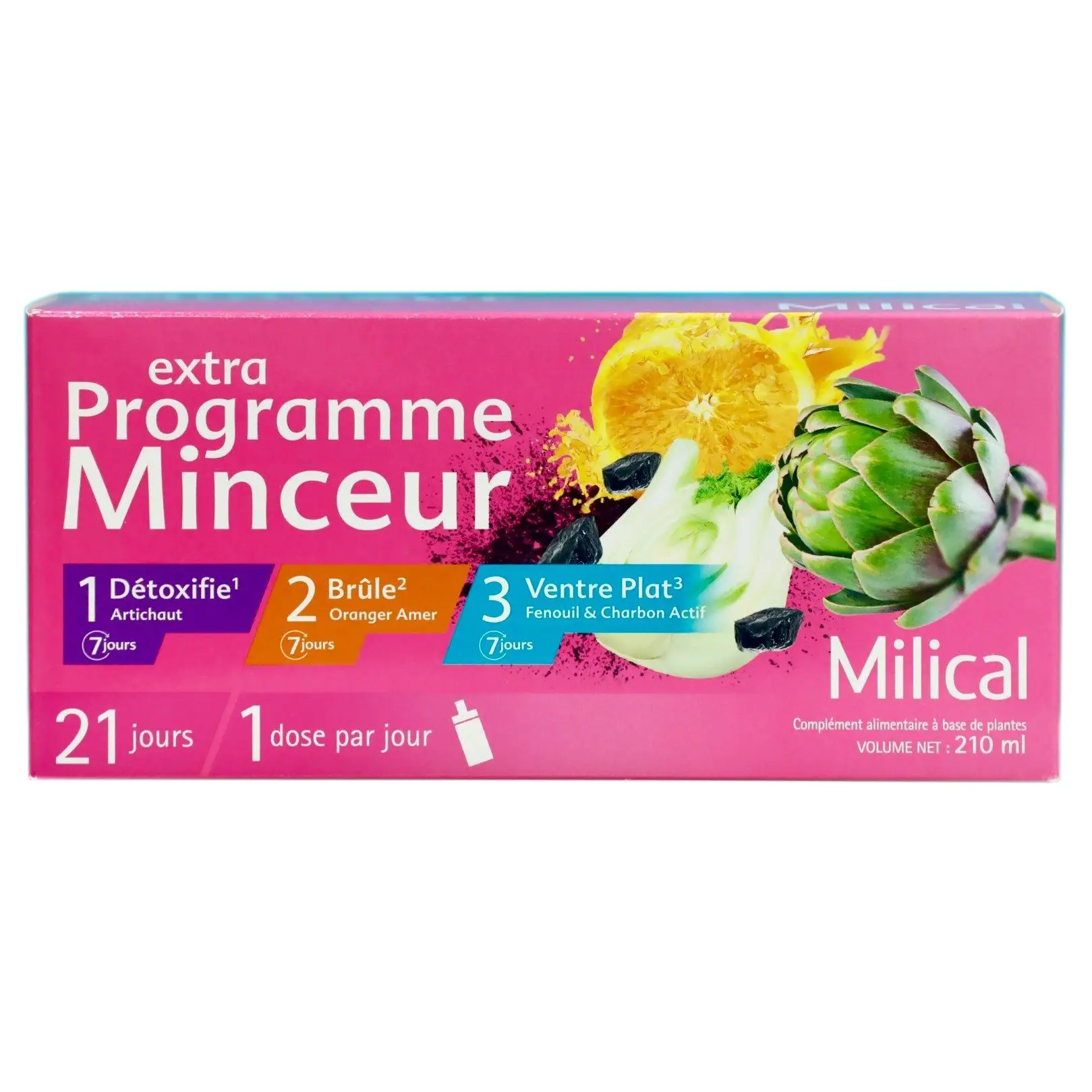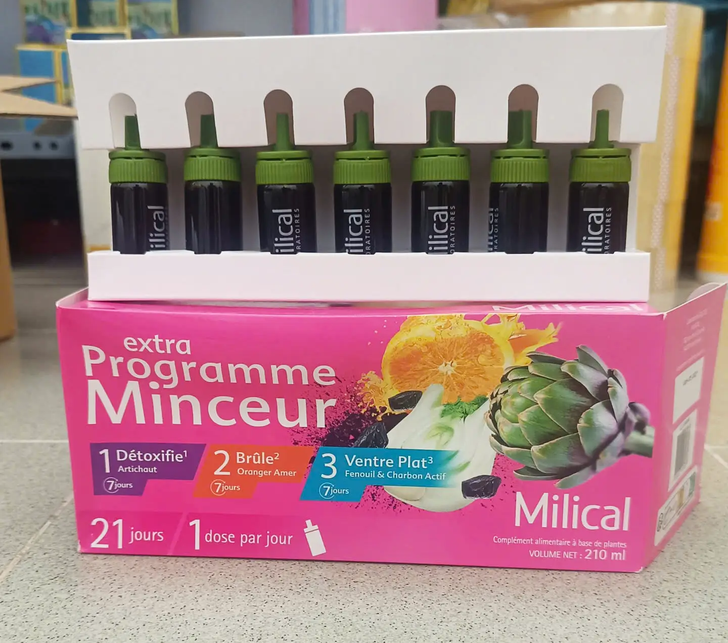 - Giảm cân 3 giai đoạn Milical Extra Programme Minceur là chương trình hỗ trợ vóc dáng trong 21 ngày, kết hợp 3 công thức bổ trợ nhằm hỗ trợ thanh lọc, hỗ trợ chuyển hóa chất béo và hỗ trợ vòng bụng gọn hơn. Sản phẩm được chia thành 3 giai đoạn dùng nối tiếp: Extra Détox, Extra Brûle-Graisses và Extra Ventre Plat, giúp người dùng theo dõi liệu trình dễ dàng hơn mỗi ngày. Dạng ống uống 10ml tiện lợi, có thể uống trực tiếp hoặc pha với nước, phù hợp với người bận rộn. Theo mô tả từ Milical, đây là chương trình tổng hợp các dòng Extra nổi bật của hãng với hương vị táo, dứa và bạc hà