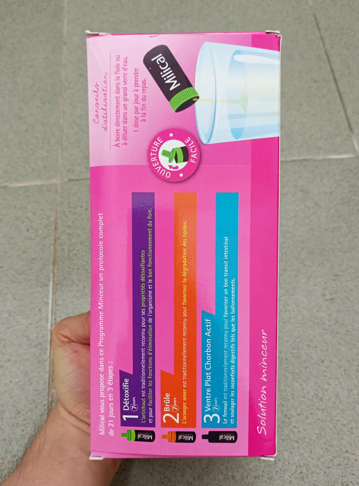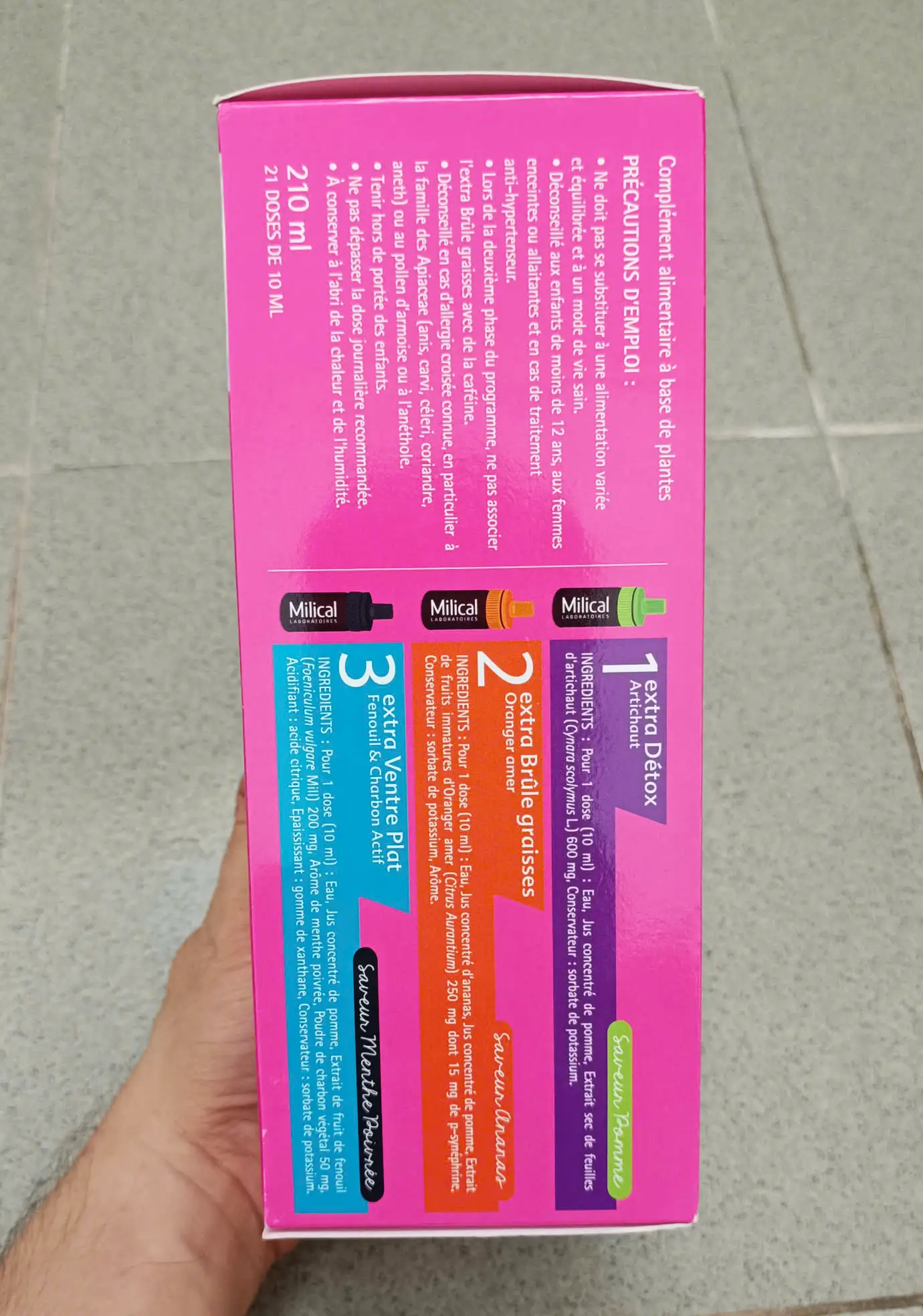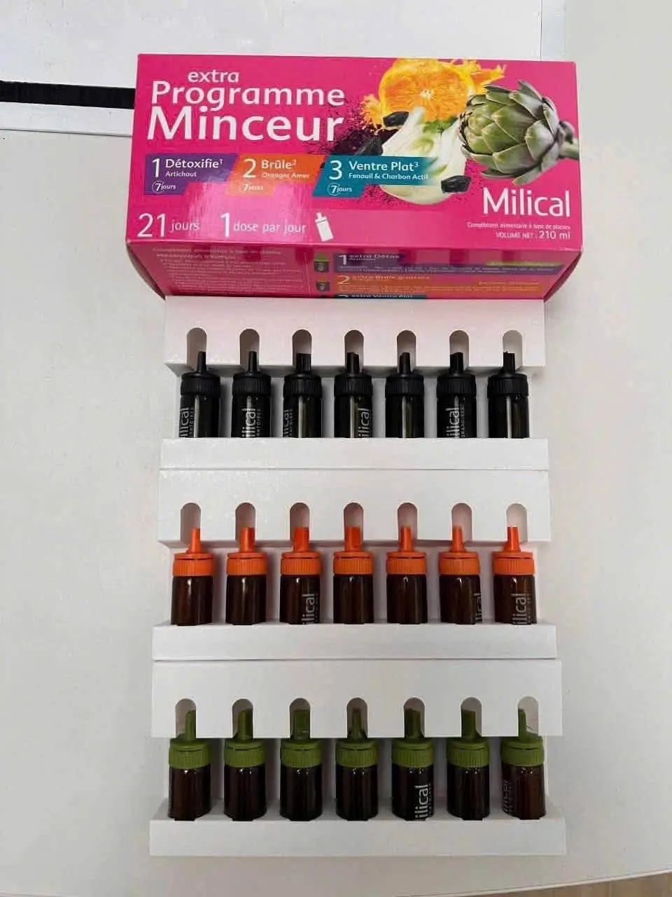 - Giảm cân 3 giai đoạn Milical Extra Programme Minceur là chương trình hỗ trợ vóc dáng trong 21 ngày, kết hợp 3 công thức bổ trợ nhằm hỗ trợ thanh lọc, hỗ trợ chuyển hóa chất béo và hỗ trợ vòng bụng gọn hơn. Sản phẩm được chia thành 3 giai đoạn dùng nối tiếp: Extra Détox, Extra Brûle-Graisses và Extra Ventre Plat, giúp người dùng theo dõi liệu trình dễ dàng hơn mỗi ngày. Dạng ống uống 10ml tiện lợi, có thể uống trực tiếp hoặc pha với nước, phù hợp với người bận rộn. Theo mô tả từ Milical, đây là chương trình tổng hợp các dòng Extra nổi bật của hãng với hương vị táo, dứa và bạc hà