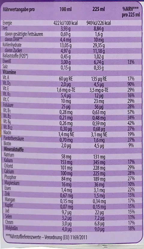 - Tinh bột ngô thủy phân, sucrose, dầu thực vật (dầu hạt cải dầu, dầu hướng dương giàu axit oleic, dầu hướng dương, dầu MCT từ dầu hạt cọ), protein sữa cô đặc, maltodextrin, protein đậu nành cô lập, oligofructose (FOS*),