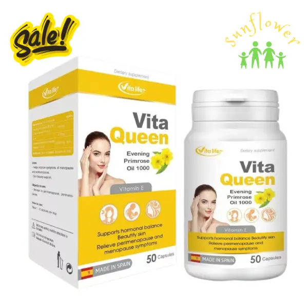 - Viên uống Vita Queen Evening Primrose Oil 1000 chính là giải pháp toàn diện giúp phụ nữ lấy lại sự cân bằng nội tiết tố một cách tự nhiên và an toàn. Sản phẩm nhập khẩu chính ngạch từ Tây Ban Nha với công thức độc quyền kết hợp tinh dầu hoa anh thảo EPO (Evening Primrose Oil) chuẩn 10% GLA và Vitamin E, mang đến hiệu quả vượt trội trong việc điều hòa hormone nữ. Vita Queen không chỉ giúp cải thiện các triệu chứng tiền mãn kinh, mãn kinh mà còn hỗ trợ làm đẹp da từ bên trong, giảm thâm nám do nội tiết tố, mang lại làn da trắng sáng, khỏe đẹp tự nhiên. Đây là sản phẩm được tin dùng bởi hàng nghìn phụ nữ Việt Nam và thế giới, được sản xuất theo tiêu chuẩn GMP châu Âu, đảm bảo chất lượng và an toàn tuyệt đối.