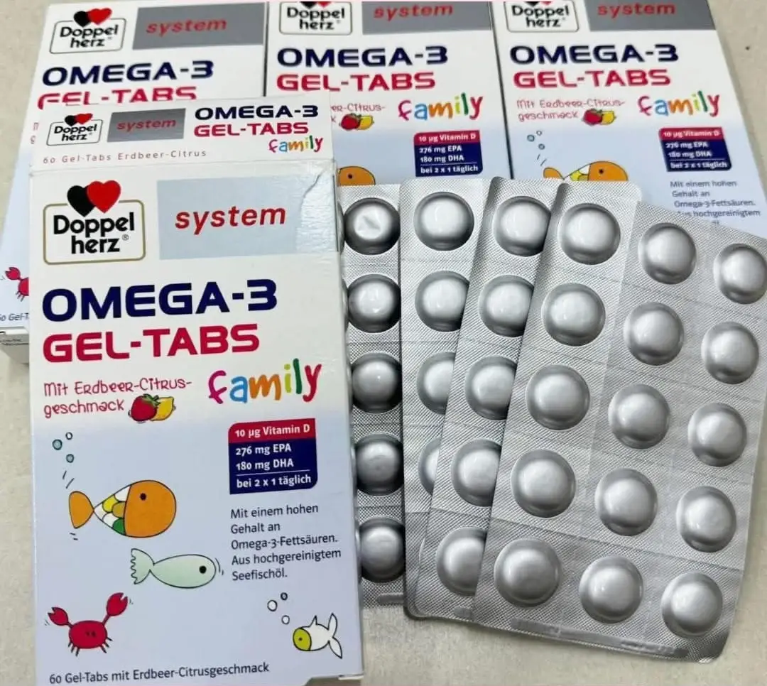 - Doppelherz System Omega-3 Gel-Tabs Family 60 viên là sản phẩm đến từ Đức, được thiết kế dưới dạng viên nhai mềm, hương vị dâu – cam tự nhiên thơm ngon, dễ dùng cho cả trẻ em và người lớn. Mỗi viên chứa hàm lượng cao EPA, DHA tinh khiết từ dầu cá biển sâu cùng Vitamin D giúp hỗ trợ phát triển não bộ, thị giác và hệ miễn dịch. Dạng gel tabs tiện lợi giúp hấp thu tốt hơn, không gây tanh, an toàn khi sử dụng lâu dài.