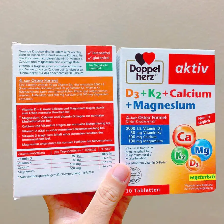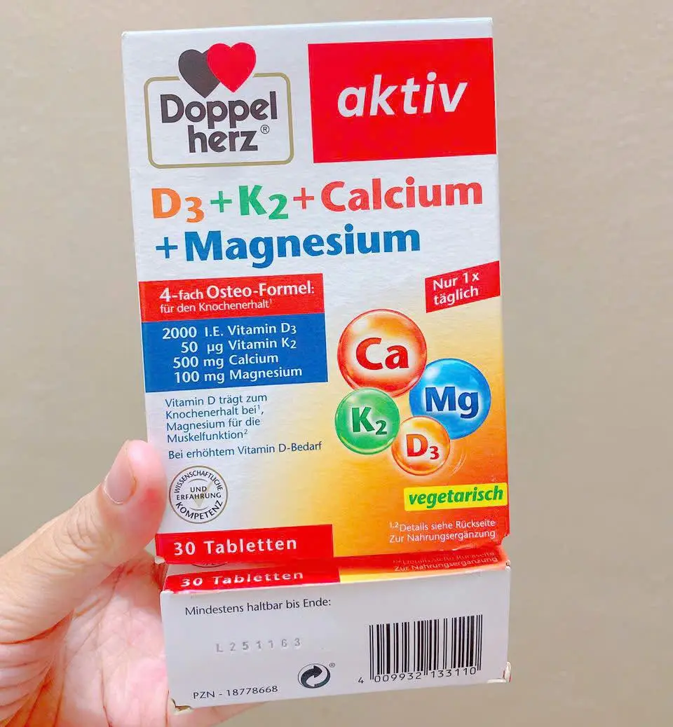 - Viên uống Doppelherz Aktiv D3 + K2 + Calcium + Magnesium 30 viên của Đức là sự kết hợp hoàn hảo của 4 thành phần thiết yếu, hỗ trợ duy trì hệ xương chắc khỏe và cơ bắp linh hoạt. Sản phẩm cung cấp liều lượng chuẩn xác giúp bổ sung vitamin và khoáng chất hiệu quả, phù hợp cho người có nhu cầu tăng cường sức khỏe xương khớp. Viên uống được sản xuất theo công nghệ tiên tiến của Đức, mang lại sự an tâm và tin cậy.