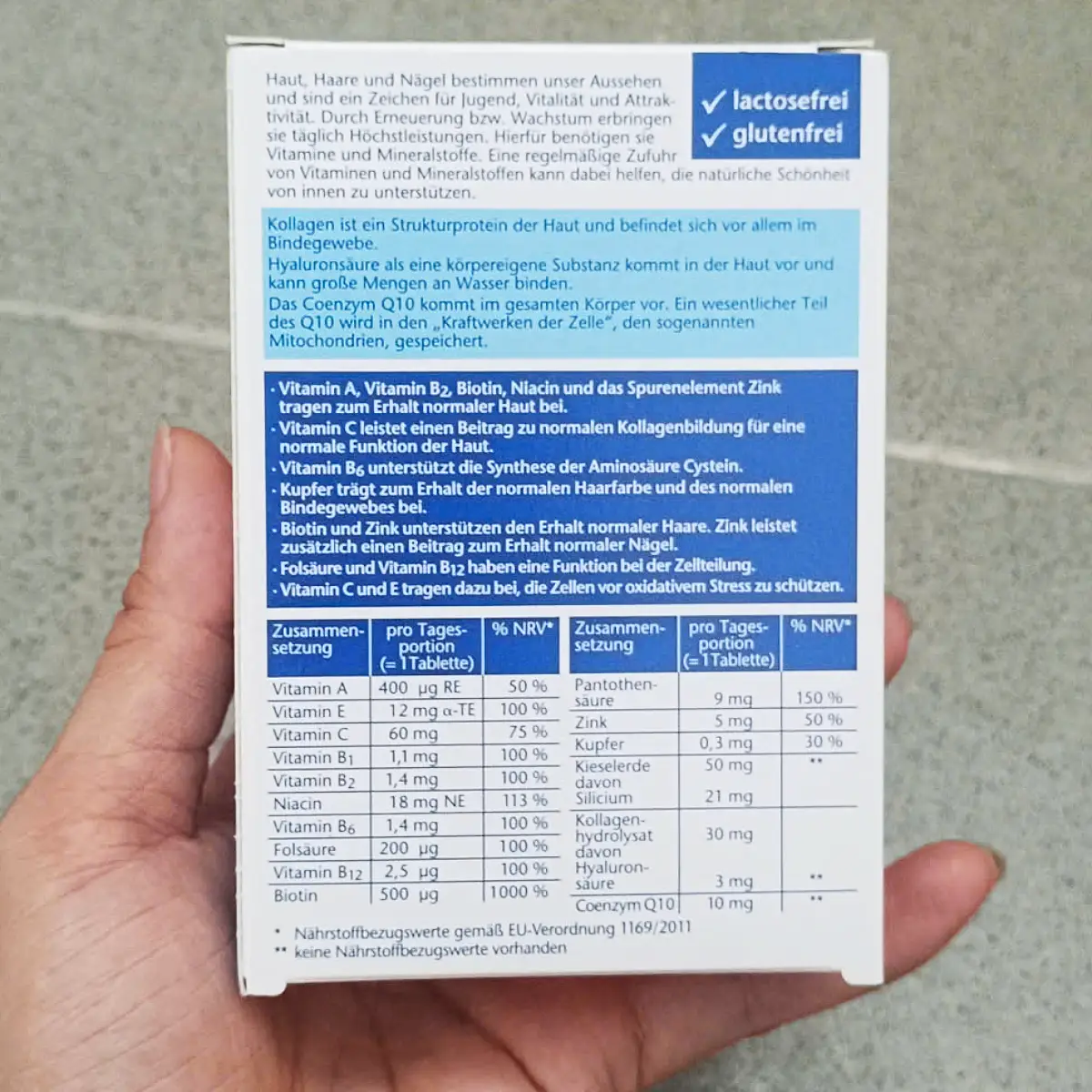 - Viên uống Doppelherz Haut Haar Nagel 30 viên đến từ Đức là giải pháp hỗ trợ nuôi dưỡng da, tóc và móng từ bên trong. Sản phẩm chứa 13 dưỡng chất quý, bao gồm Collagen, Q10, Hyaluronic, Biotin, Kẽm và Đồng. Nhờ công thức toàn diện, sản phẩm giúp bạn sở hữu làn da mịn màng, mái tóc óng khỏe và móng tay chắc chắn.