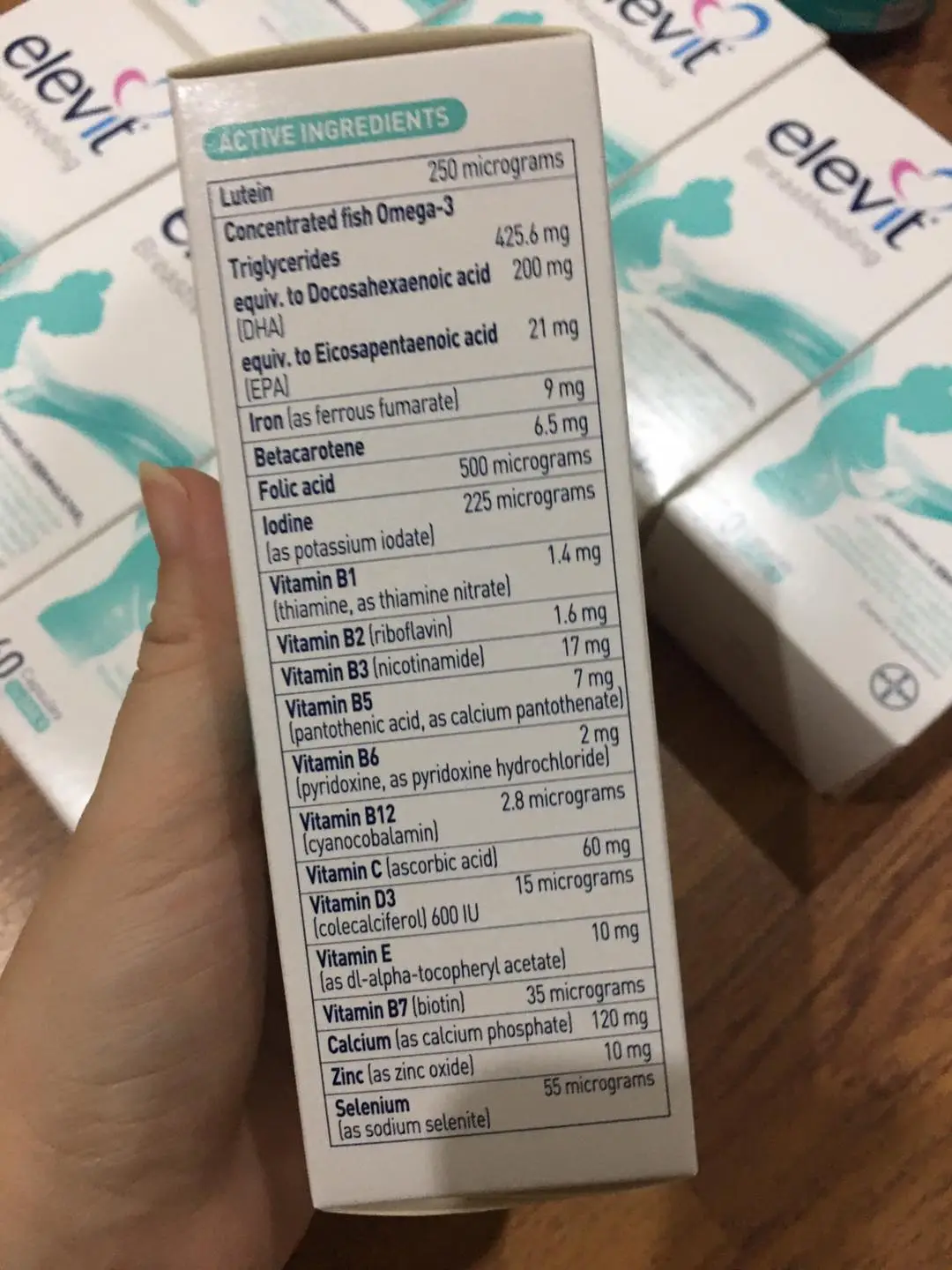 Thuốc Elevit Úc sau sinh, cho con bú (Breastfeeding tăng cường chất lượng sữa mẹ) nhờ cung cấp vitamin và khoáng chất cần thiết cho phụ nữ sau sinh và cho con bú, vì vậy thành phần của thuốc bổ hầu hất là các nguyên tố đa, vi lượng và các loại vitamin cần thiết: